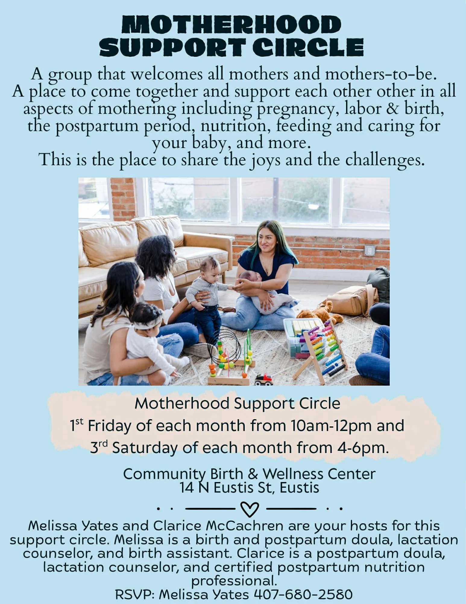 Join us for Motherhood Support Circle in Eustis on the 1st Friday and 3rd Saturday of each month. Details are on the flyer.